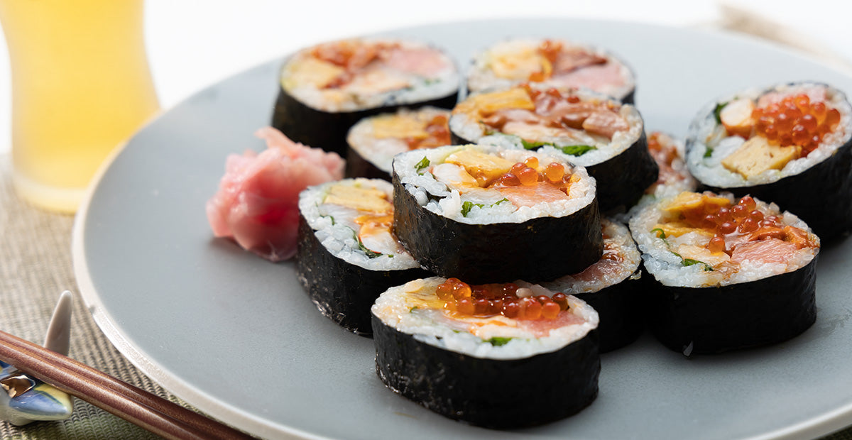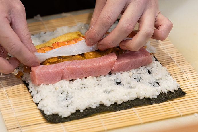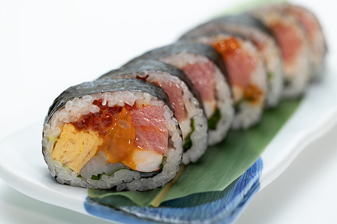 店では日本海の旬魚を中心に、その季節で最高においしい魚貝や野菜を厳選し調理していますが、太巻きはいつ食べても安定しておいしい、バランスの良い組み合わせを第一に考えています。トロやウニなどは四季折々もっとも美味な産地から取り寄せ、相伝の玉子焼きと合わせて、有明の最高級海苔で巻き込んでいます。